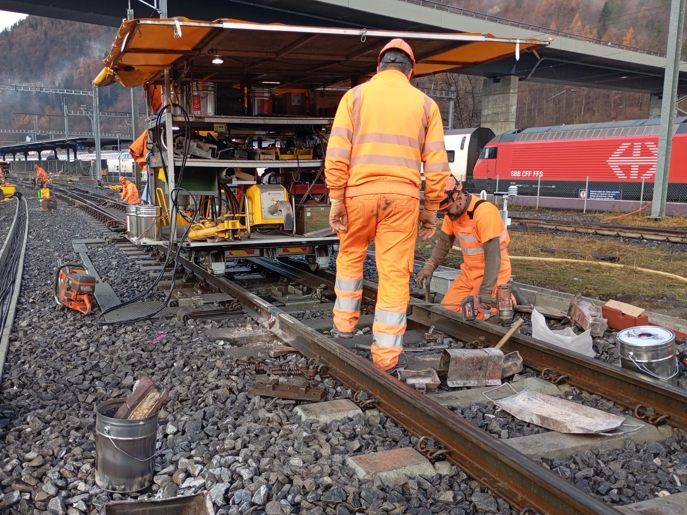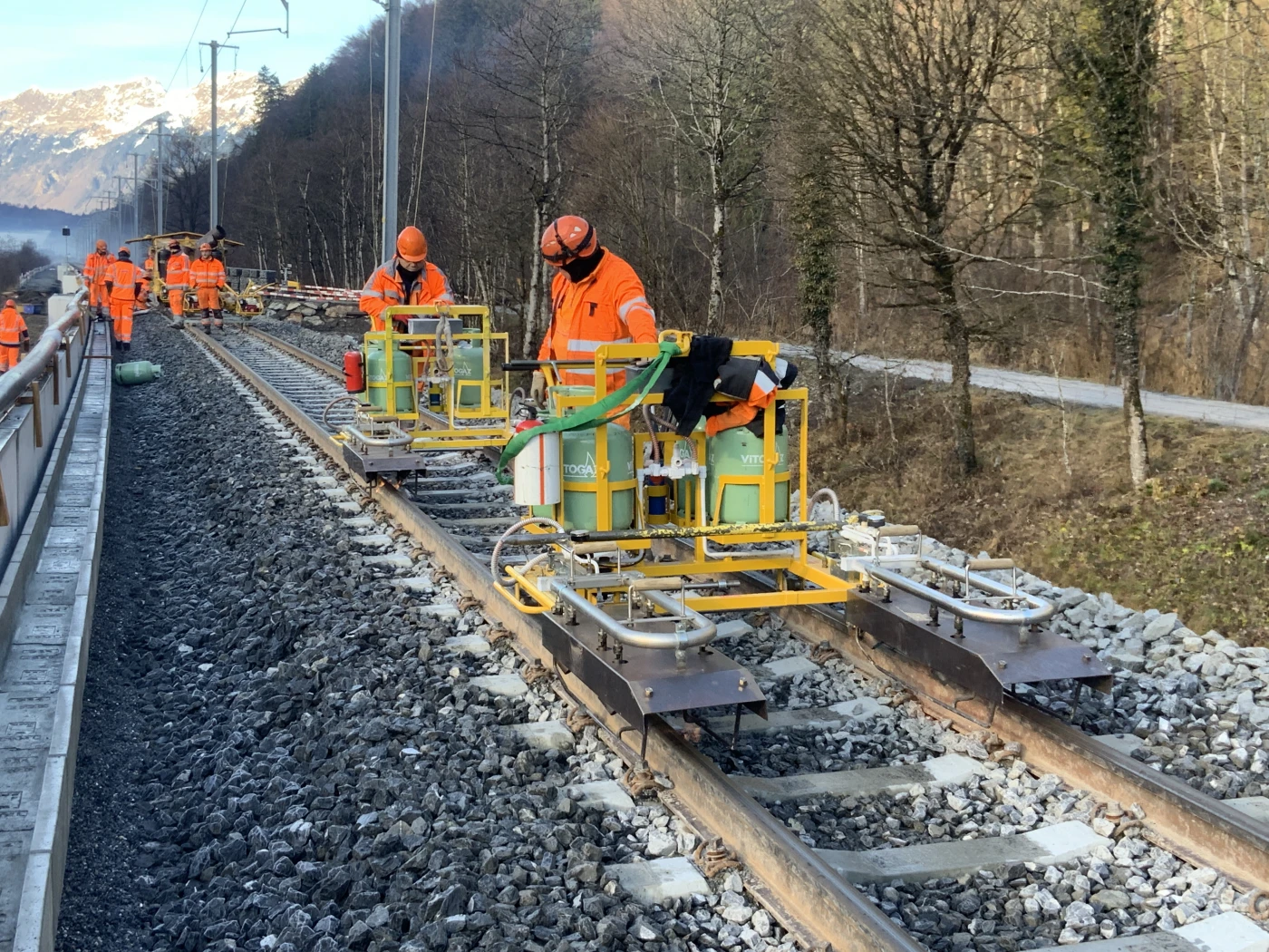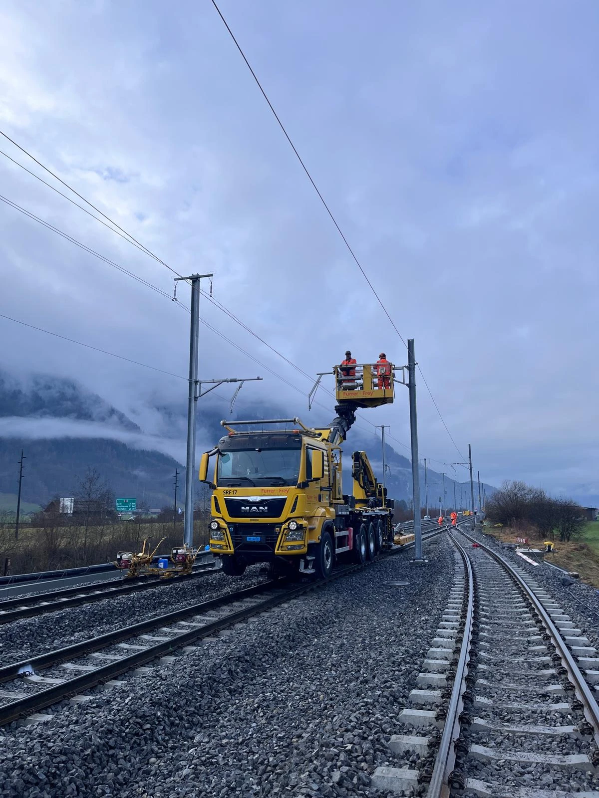 Die Zugänglichkeiten zu einigen Abschnitten sind herausfordernd. Aus diesem Grunde kommt es für vereinzelte Arbeiten wie zum Beispiel der Montage von Fahrleitungsmasten zum Einsatz von Helikoptern.